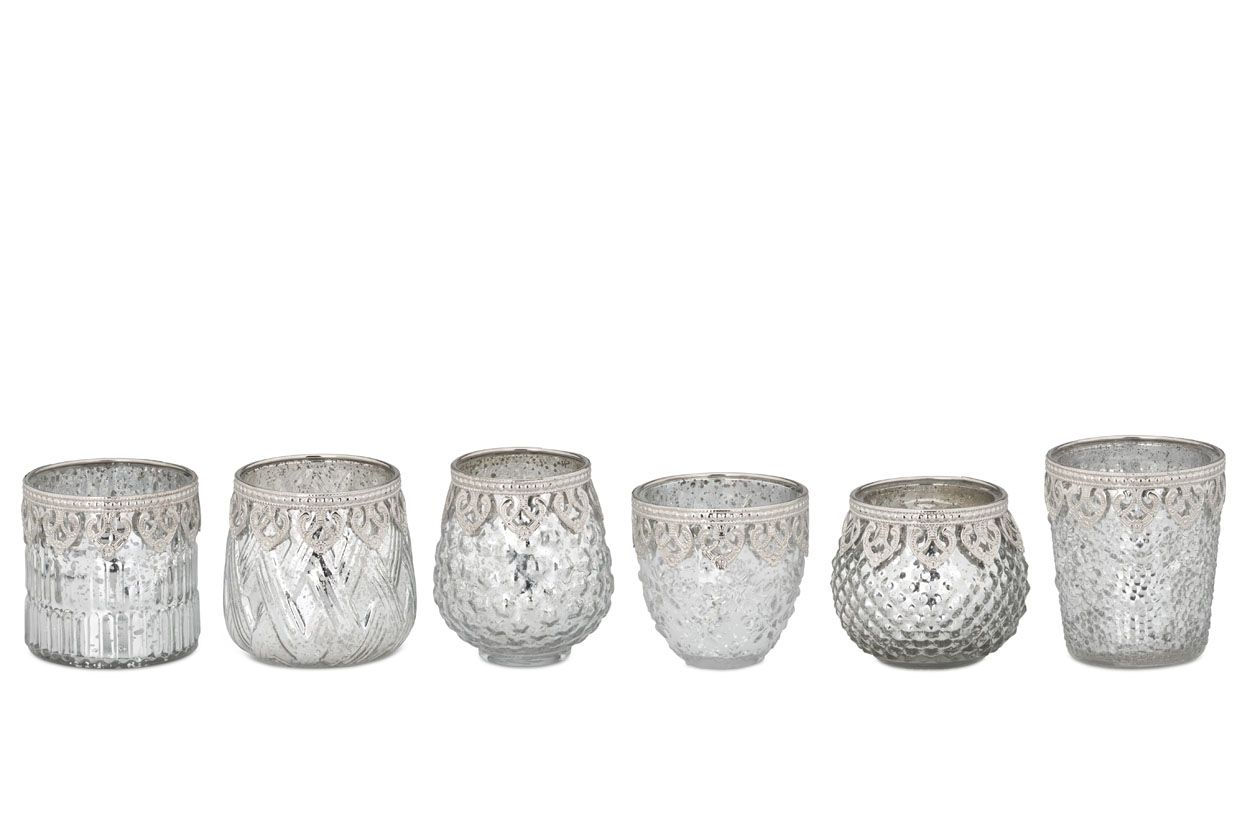 6-teiliges Windlichtset aus Glas und Silber, mit unterschiedlichen Dekoren und Perlrand. Höhe 9 -10,5 cm.