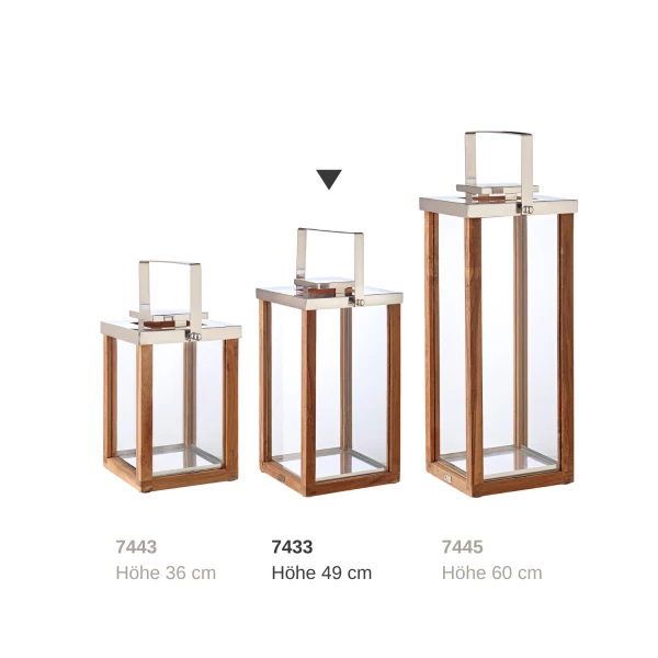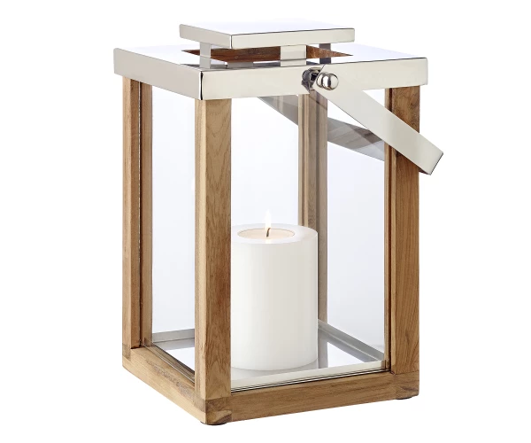 Laterne Huntsville, Höhe 49 cm aus edlem Teakholz, Edelstahl glänzend vernickelt