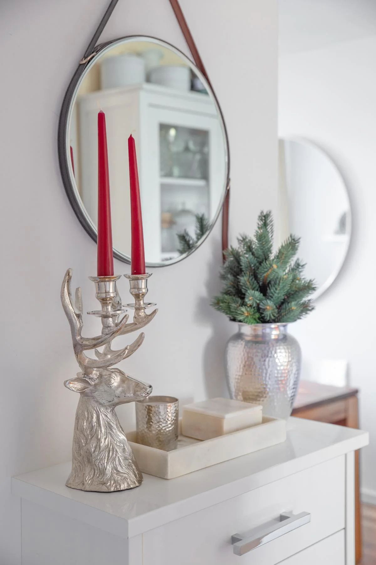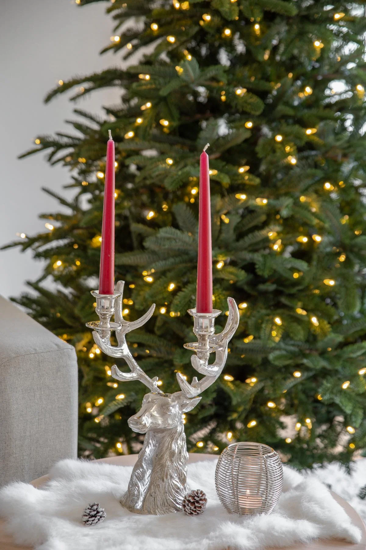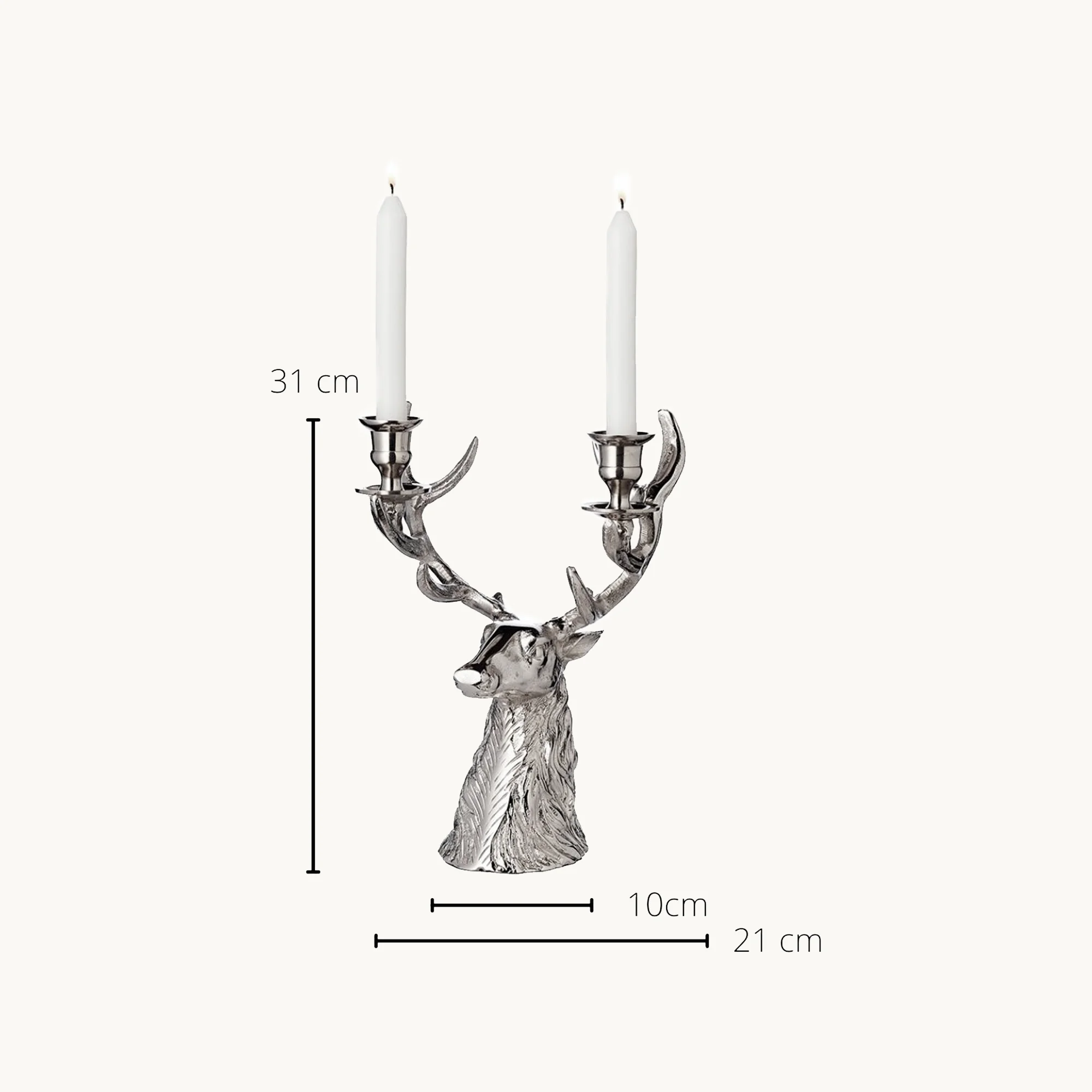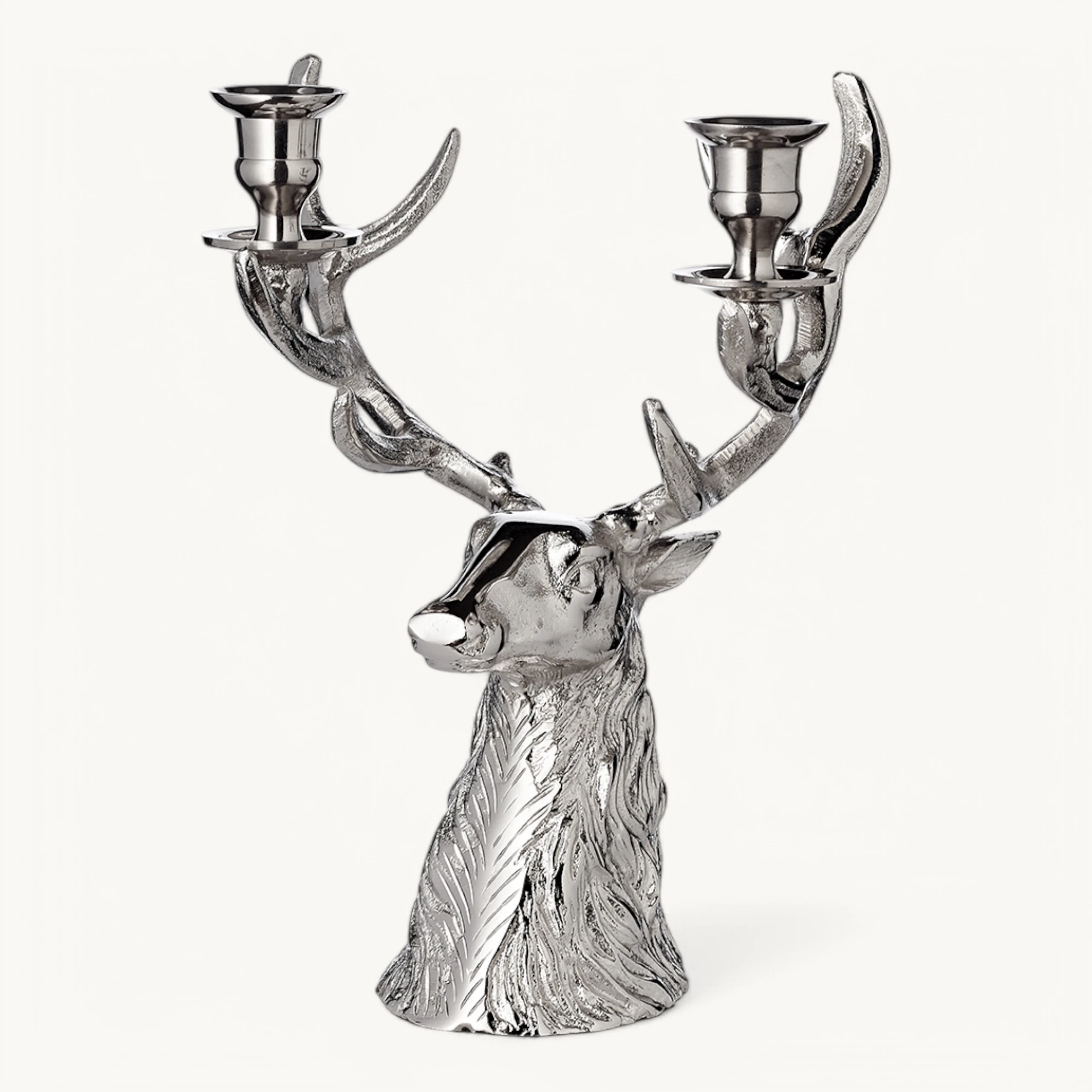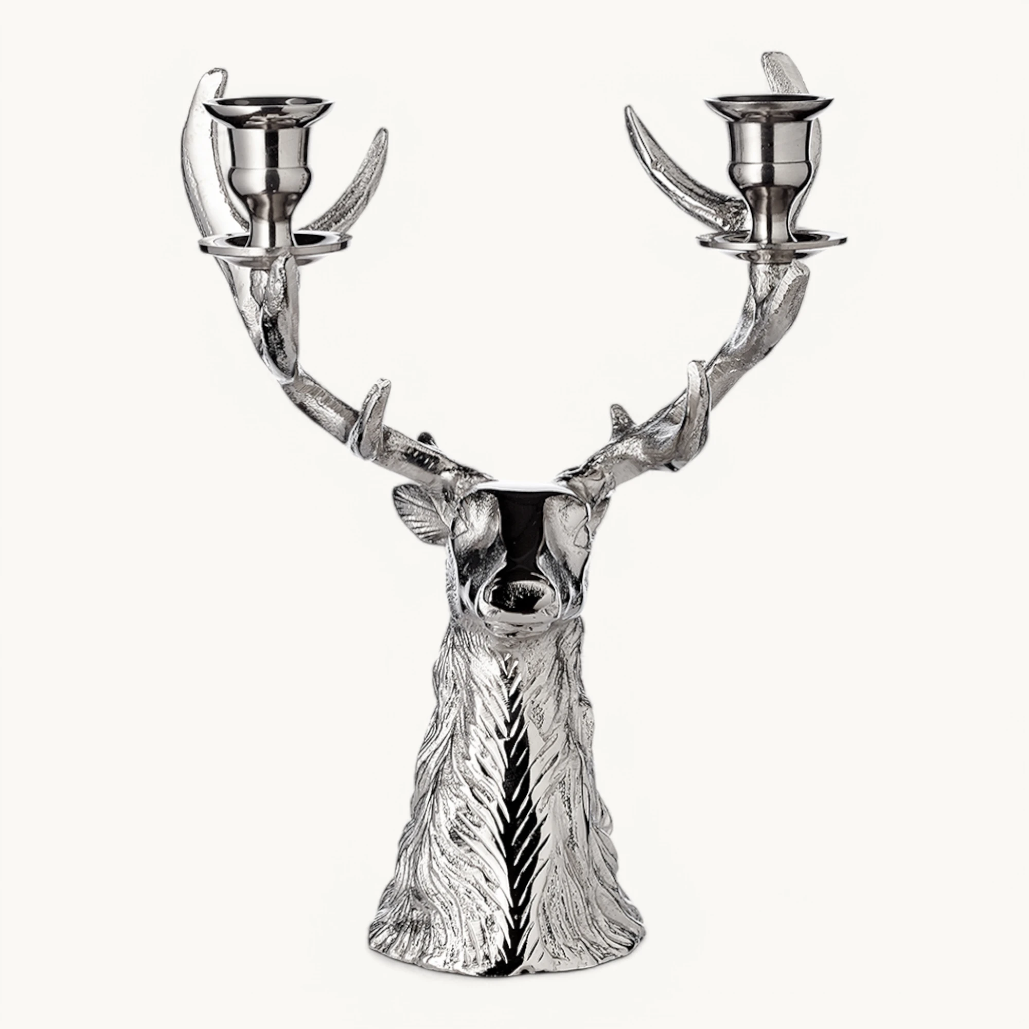 Der Hirschkopf ist aus hochwertigem vernickelten Aluminium gefertigt und vier Stabkerzen finden Platz auf dem imposanten Geweih.