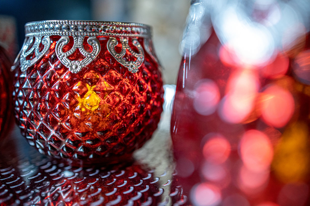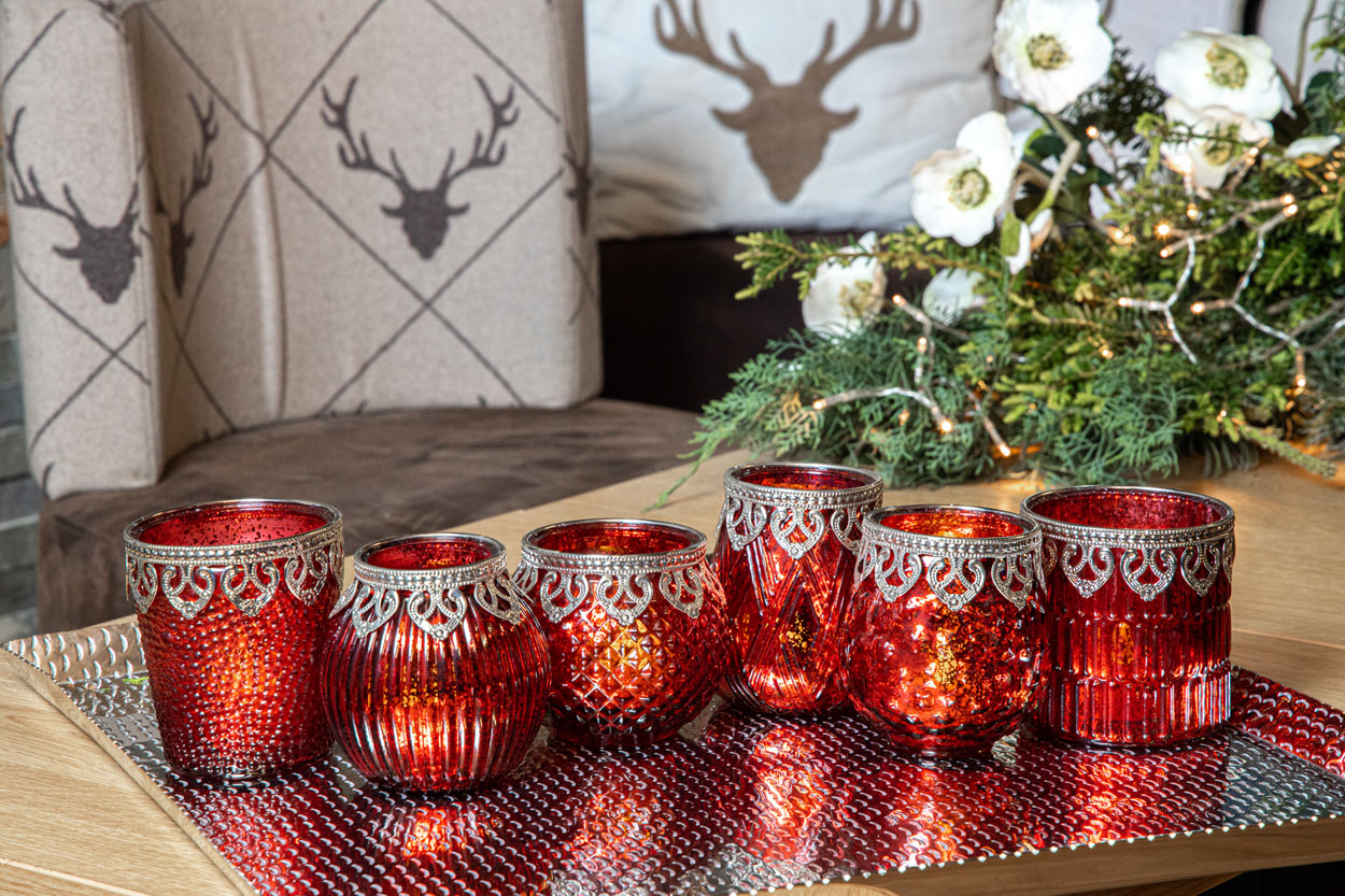 6-teiliges rotes Windlichtset aus Glas und Silber, mit unterschiedlichen Dekoren und Perlrand. Höhe 9 -10,5 cm.