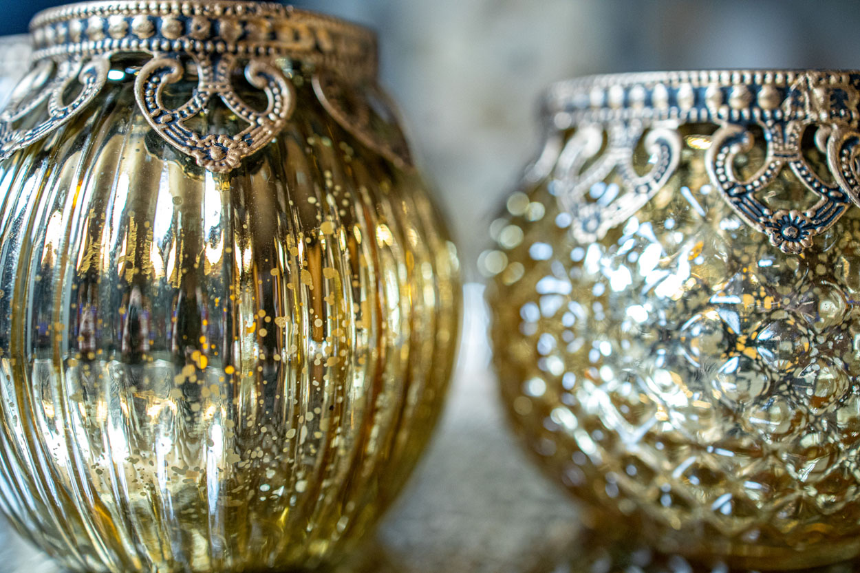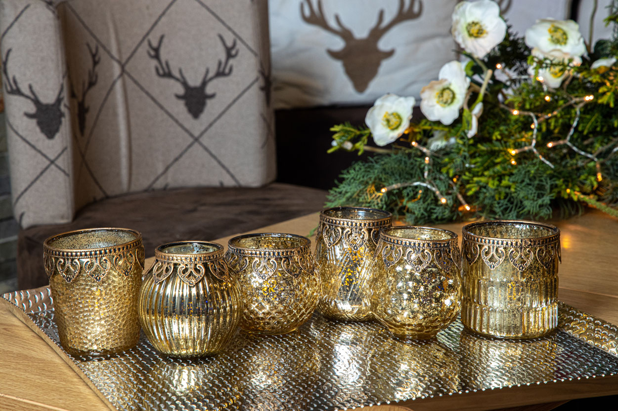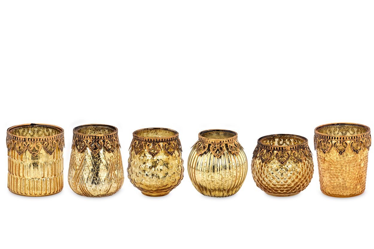 6-teiliges Windlichtset aus goldfarbenen Glas mit Perlrand in 6 unterschiedlichen Dekoren. Höhe 9 -10,5 cm.