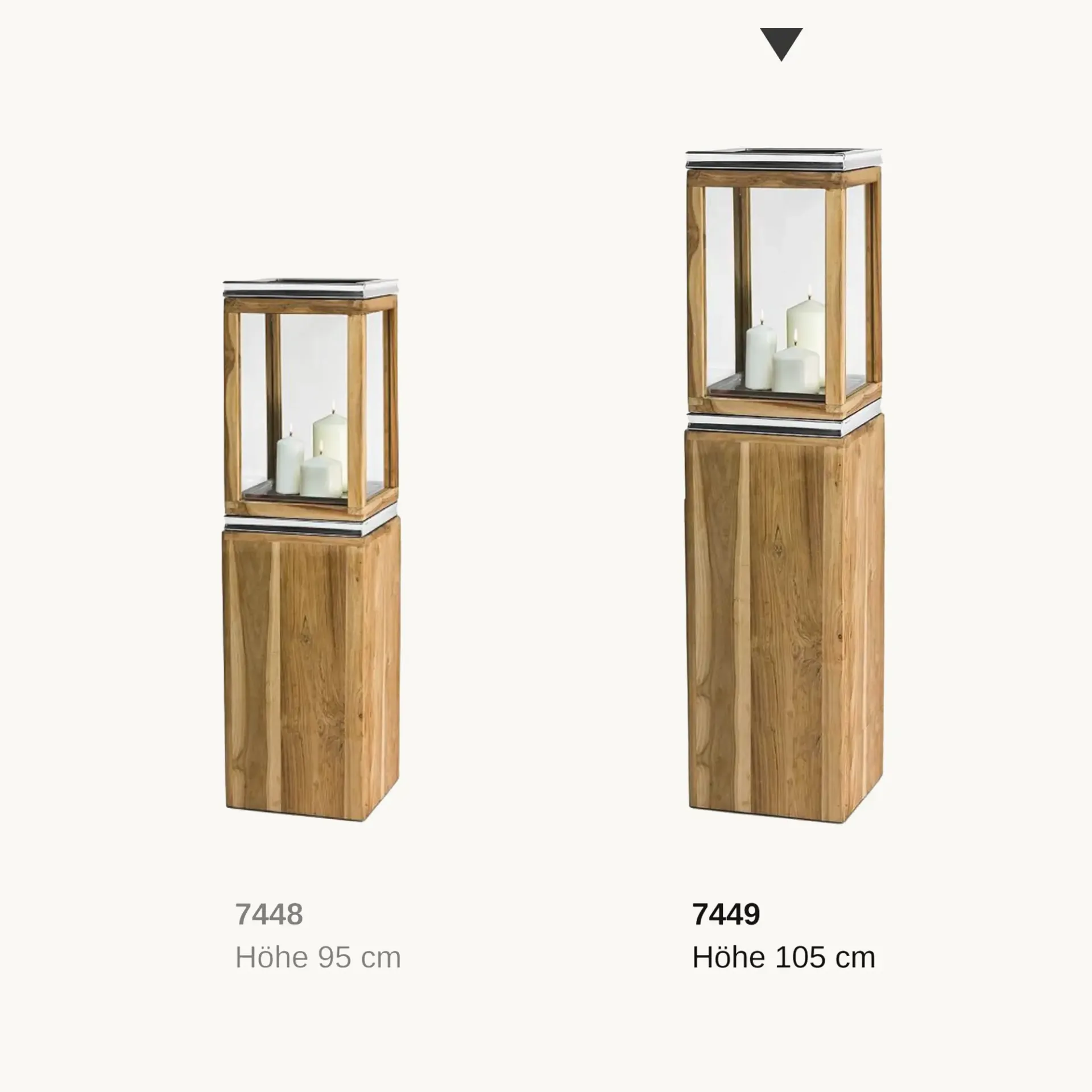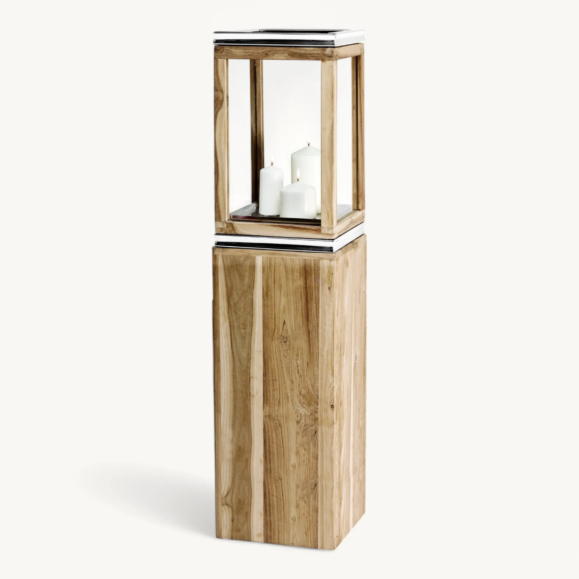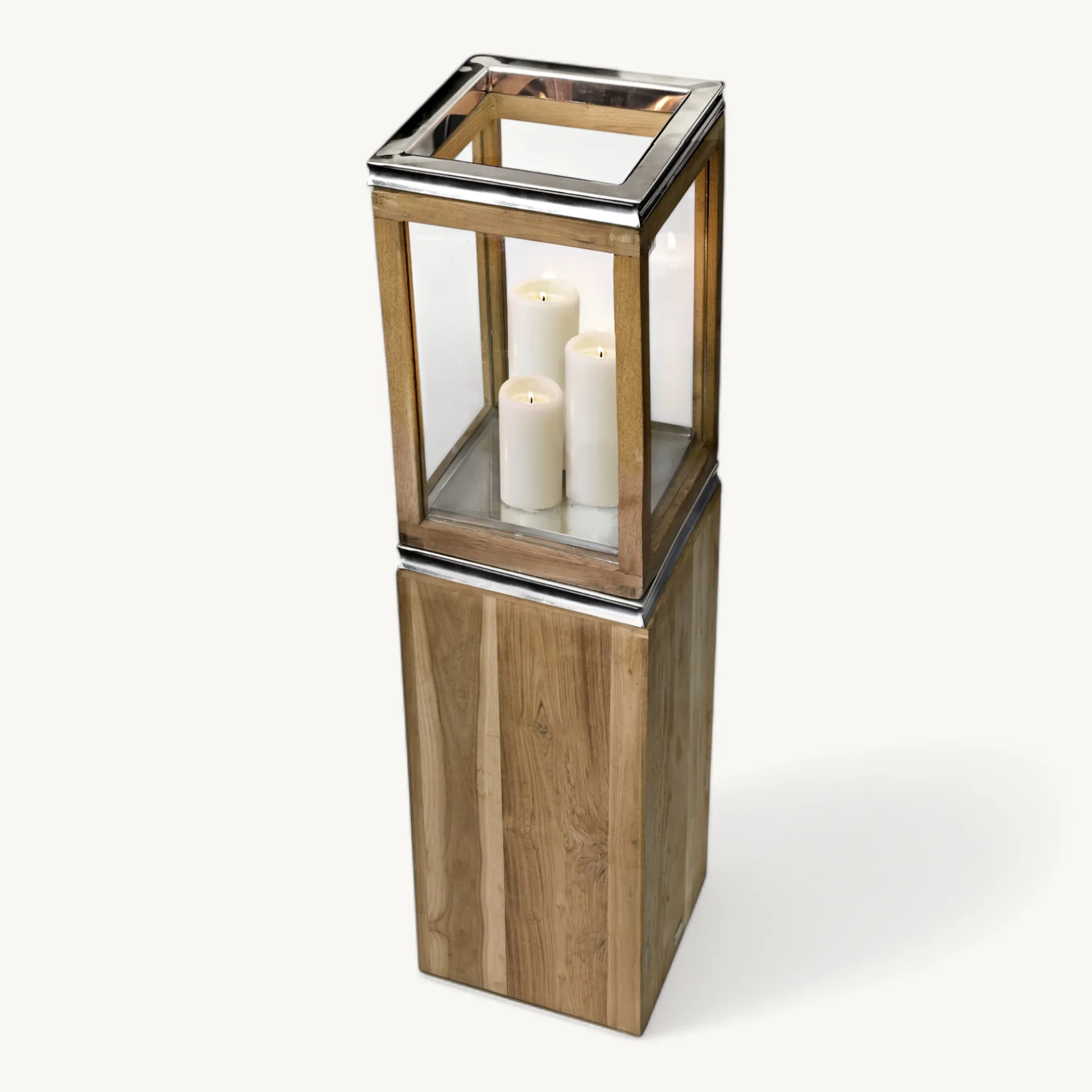Großes Windlicht aus edlem Teakholz auf Sockel, eine gelungene Kombination aus Teakholzolz, Glas und silbernen Akzenten, Höhe 105 cm.