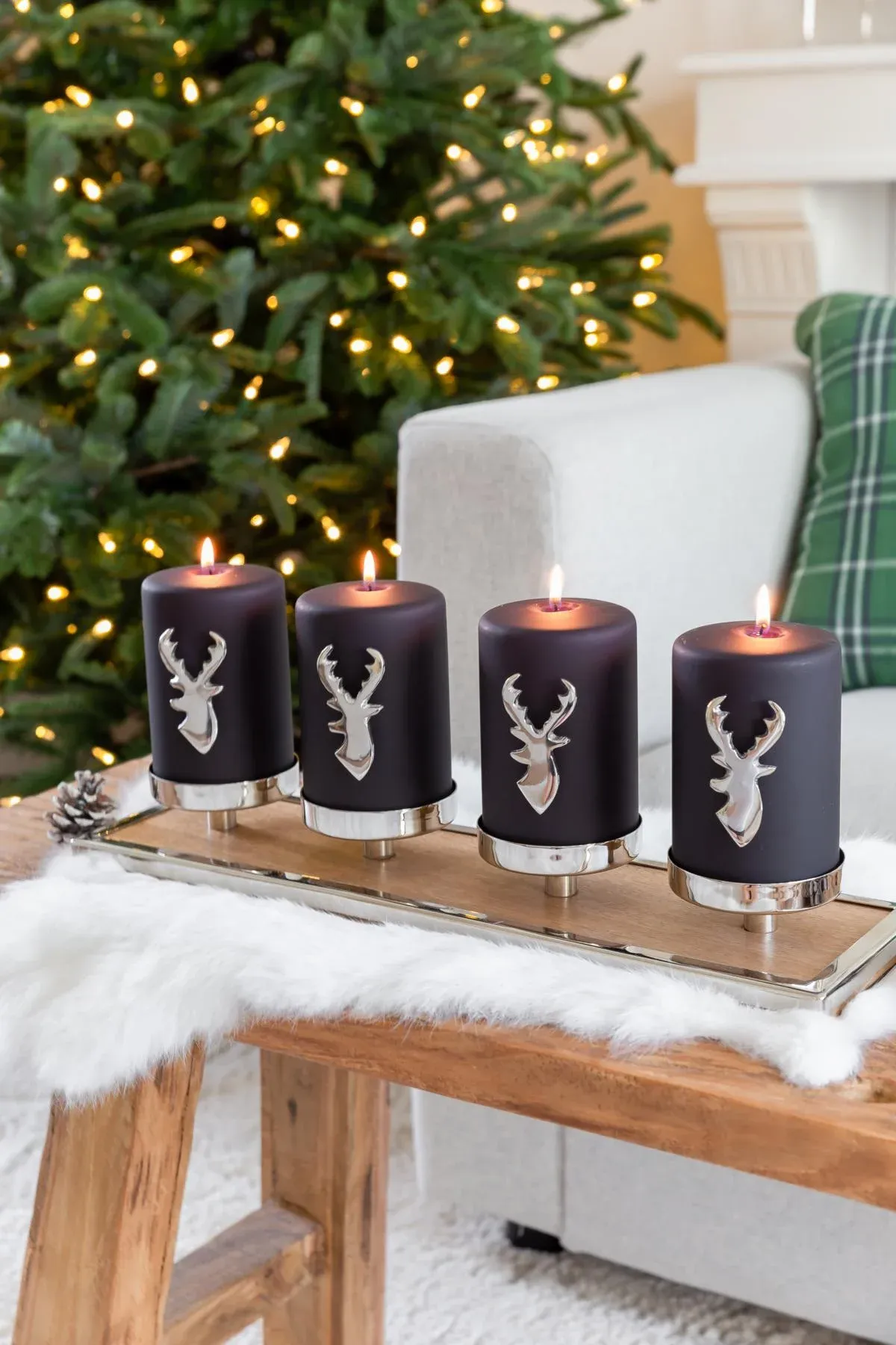 Adventskerzenhalter mit 4 Kerzenhalterungen montiert auf einer 45 cm langen Mangoholzschale für vielseitige weihnachtliche Dekorationsmöglichkeiten.
